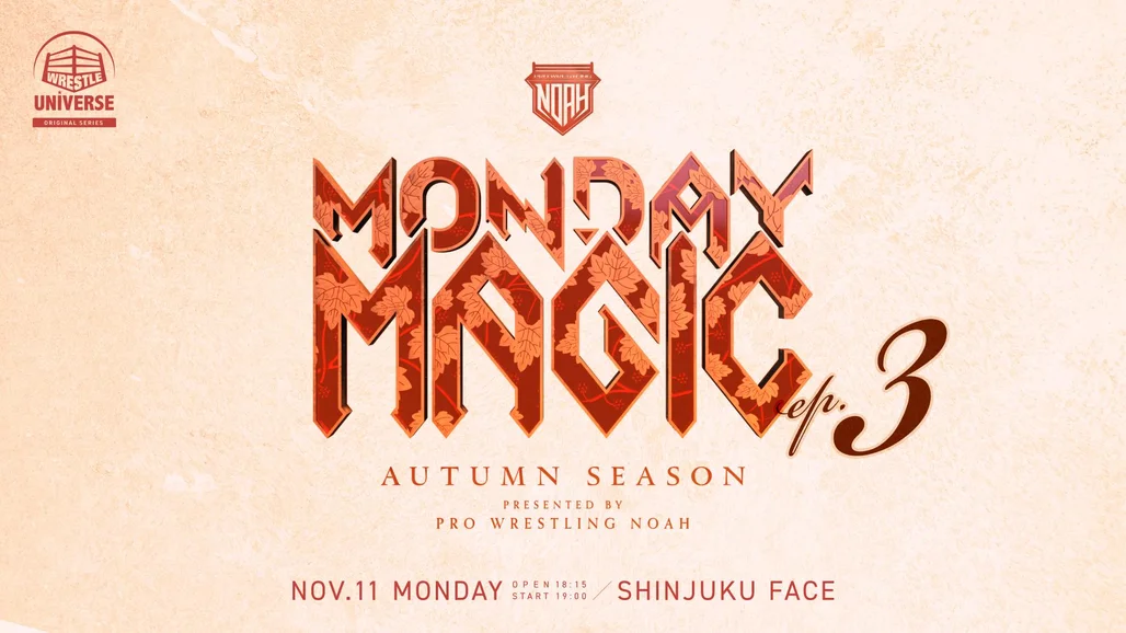 MONDAY MAGIC Autumn ep3 Start at 7:00 PM(JP) ■Match Lineup ◯The 1st Match・Tag Team Match Shuji Ishikawa & Shuji Kondo vs Masato Tanaka & Takuya Sugawara ◯The 2nd Match・5WAY Match AMAKUSA vs Starboy Charlie vs Alejandro vs Eita vs Dragon Bane ◯The 3rd Match・6-man Tag Team Match Manabu Soya & Masa Kitamiya & Ulka Sasaki vs Hijo del Dr. Wagner Jr. & Anthony Greene & Vinnie Massaro ◯The 4th Match・WCP World Heavyweight Championship Match 60-Minute Single Match Kevin Blackwood vs Titus Alexander ◯Semi-Final・GHC Women's Championship~Inaugural Champion Decider Match~MAGIC RUMBLE 10WOMAN BATTLE Kouki Amarei vs Sadie Gibbs ◯Main Event・Tag Team Match Kaito Kiyomiya & Kai Fujimura vs Takashi Sugiura & Yu Owada
