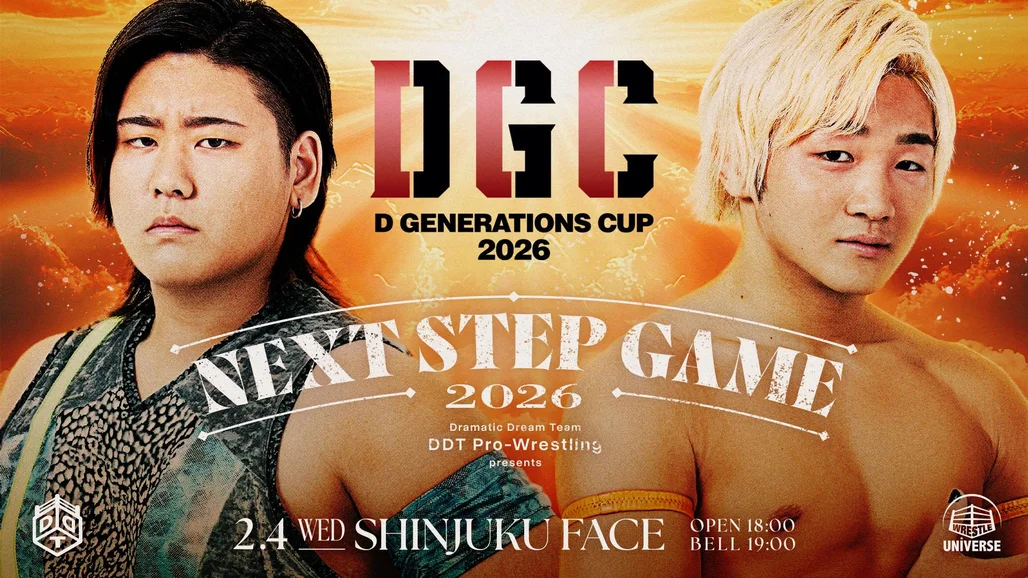 Start at 7:00 PM ■Match Lineup 〇Opening Match・"D GENERATIONS CUP 2026" B Block Official League Match 15-Minute Single Match Yuya Koroku<2 wins, 4 points> vs Hinata Kasai<2 losses, 0 points> ◯The 2nd Match・"D GENERATIONS CUP 2026" B Block Official League Match 15-Minute Single Match Takeshi Masada<1 win, 1 loss, 2 points> vs Yuni<1 win, 2 losses, 2 points> ◯The 3rd Match・Tag Team Match 30-Minute Single Match Jun Akiyama & Danshoku Dieno vs Toru Owashi & Kazuki Hirata ◯The 4th Match・3WAY 6-man Tag Team Match 30-Minute Single Match Daisuke Sasaki & Hideki Okatani & Mj Paul vs Chris Brookes & HARASHIMA & Antonio Honda vs Akito & Junta Miyawaki & Yuki Ishida ◯The 5th Match・Special 6-man Tag Team Match 30-Minute Single Match Yuki Ueno & Shinya Aoki & Tomomitsu Matsunaga vs MAO & KANON & Yukio Naya ◯Semi-Final・"D GENERATIONS CUP 2026" A Block Official League Match 15-Minute Single Match To-y<1 win, 1 draw, 3 points> vs Ilusion<3 losses, 0 points> ◯Main Event・"D GENERATIONS CUP 2026" A Block Official League Match 15-Minute Single Match Daichi Satoh<2 wins, 4 points> vs Kazuma Sumi<1 win, 1 loss, 2 points> *DGC scores are as of the conclusion of the Yokohama tournament on January 17.