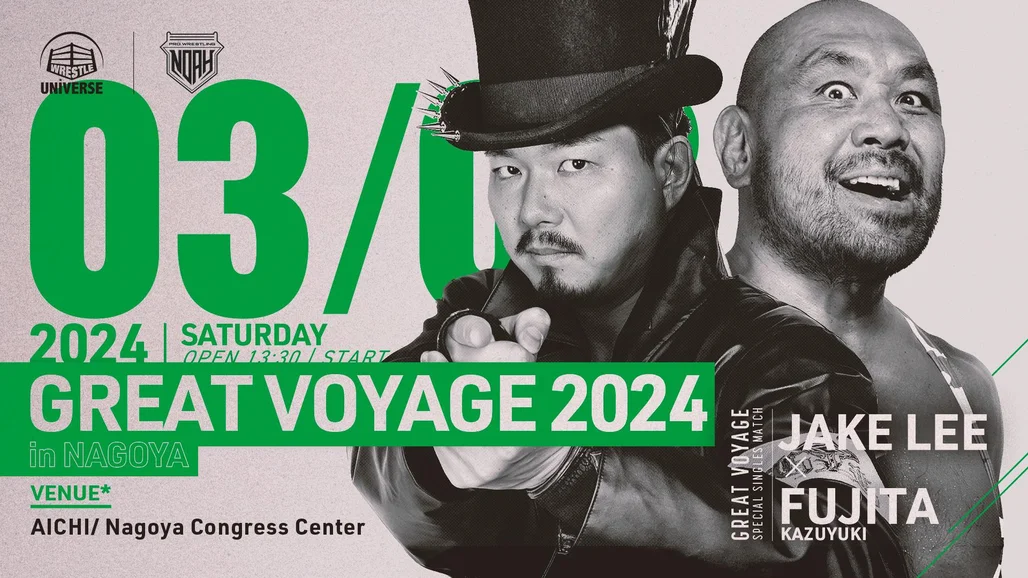 GREAT VOYAGE 2024 in NAGOYA ■Match Lineup 〇Victory Challenge Tag League Official Match Kaito Kiyomiya & Ryohei Oiwa vs Takashi Sugiura & Ulka Sasaki 〇GREAT VOYAGE Spesial Singles Match Jake Lee vs Kazuyuki Fujita 〇Victory Challenge Tag League Official Match Go Shiozaki & Atsushi Kotoge vs SaxonHuxley & Timothy Thatcher 〇GHC Junior Heavyweight Championship Match Daga vs Tadasuke *The 54th Champion's 4th defending match. 〇Victory Challenge Tag League Official Match Masa Kitamiya & Daiki Inaba vs Manabu Soya & Shuji Kondo 〇Victory Challenge Tag League Official Match Kenoh & Yu Owada vs Dragon Bane & Alpha Wolf 〇Singles Match HAYATA vs LJ・Cleary 〇6-man Tag Team Match Jack Morris & Anthony Greene & YO-HEY vs Naomichi Marufuji & Yoshinari Ogawa & Super Crazy 〇Tag Team Match Akitoshi Saito & Hi69 vs Hajime Ohara & Junta Miyawaki 〇Singles Match Ninja Mack vs Alejandro