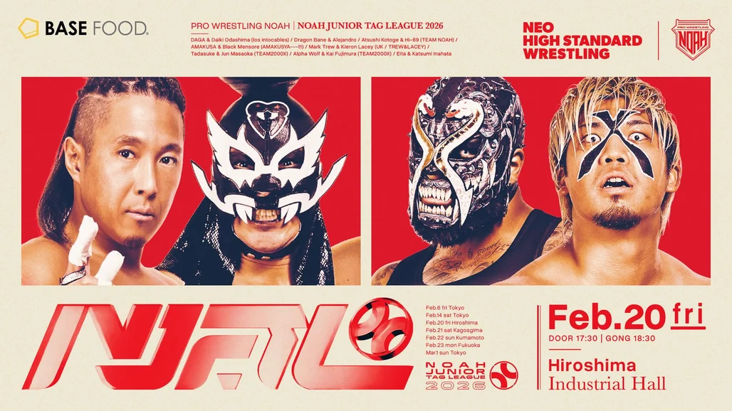 Start at 6:30 PM ■Match Lineup ◯The 1st Match・Singles Match 15-Minute Single Match Manabu Soya vs Hiroto Tsuruya ◯The 2nd Match・8-man Tag Team Match 20-Minute Single Match Yoshiki Inamura & KENTA & Tetsuya Endo & HAYATA vs Kenoh & Hajime Ohara & Aoi Takahashi & Hayato Koyanagi ◯The 3rd Match・NOAH Jr. TAG LEAGUE 2026 Official Matches 15-Minute Single Match AMAKUSA & Black Mensore vs Alpha Wolf & Kai Fujimura ◯The 4th Match・NOAH Jr. TAG LEAGUE 2026 Official Matches 15-Minute Single Match Mark Trew & Kieron Lacey vs Tadasuke & Jun Masaoka ◯The 5th Match・NOAH Jr. TAG LEAGUE 2026 Official Matches 15-Minute Single Match Dragon Bane & Alejandro vs Eita & Katsumi Inahata ◯Semi-Final・NOAH Jr. TAG LEAGUE 2026 Official Matches 15-Minute Single Match Daga & Daiki Odashima vs Atsushi Kotoge & Hi69 ◯Main Event・6-man Tag Team Match 60-Minute Single Match OZAWA & Masa Kitamiya & Takashi Sugiura vs Kaito Kiyomiya & Galeno Del Mal & Harutoki