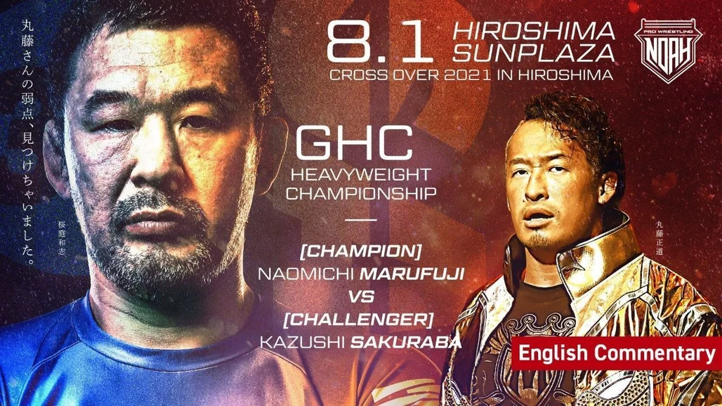 Pro-Wrestling NOAH [CROSS OVER 2021 in HIROSHIMA] 2021/8/1 Hiroshima ■Match Lineup ○GHC Heavyweight Championship <Champion> Naomichi Marufuji vs Kazushi Sakuraba <Challenger> ○GHC Junior Heavyweight Championship <Champion> HAYATA vs YO-HEY <Challenger> ○SPECIAL TAG HIROSHIMAVS Great Muta & NOSAWA Rongai vs Kaito Kiyomiya & Atsushi Kotoge ○GHC Junior Heavyweight Tag Team Championship <Champion Team> Daisuke Harada & Hajime Ohara vs Seiki Yoshioka & Yuya Susumu <Challenger Team> ○Tag Team Match (Teams of Three) Takashi Sugiura & Kazuyuki Fujita & Kashin Kendo vs Katsuhiko Nakajima & Haoh& Nioh ○Tag Team Match Yoshinari Ogawa & Yasutaka Yano vs Kotaro Suzuki & Ikuto Hidaka