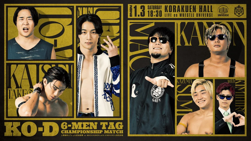 ■Match Lineup 〇Opening Match・Singles Match 30-Minute Single Match Junta Miyawaki vs Rukiya ◯The 2nd Match・10-man Tag Team Match No-Touch Rule 30-Minute Single Match Daisuke Sasaki & Hideki Okatani & Mj Paul & Demuth & Ilusion vs Tomomitsu Matsunaga & Yuya Koroku & Daichi Satoh & Yuni & Hinata Kasai ◯The 3rd Match・Special Single Match 30-Minute Single Match Shinya Aoki vs SanshiroTakagi ◯The 4th Match・6-man Tag Team Match 30-Minute Single Match Jun Akiyama & Yuki Iino & Yukio Naya vs Kazusada Higuchi & Naomi Yoshimura & Yuki Ishida ◯The 5th Match・6-man Tag Team Match 30-Minute Single Match Chris Brookes & Antonio Honda & Takeshi Masada vs HARASHIMA & Toru Owashi & Kazuki Hirata ◯Semi-Final・Special Tag Team Match 30-Minute Single Match KONOSUKE TAKESHITA & Akito vs Danshoku Dieno & Super Sasadango Machine ◯Rematch・1 vs 3 Handicap Match KONOSUKE TAKESHITA vs Danshoku Dieno & Super Sasadango Machine & Akito ◯Main Event・KO-D 6-Man Tag Team Championship 60-Minute Single Match <Champion team>Yuki Ueno & To-y & Kaisei Takechi vs MAO & KANON with KIMIHIRO & Kazuma Sumi<Challenger team>