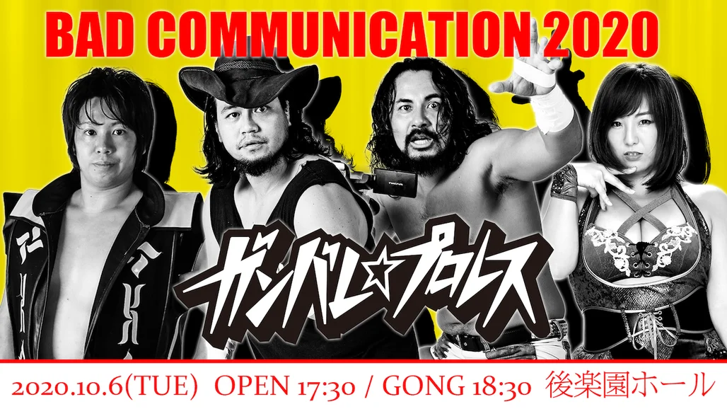 2020.10.6 Tokyo Itabashi Green Hall Ganbare Pro-Wrestling "coroblock presents BAD COMMUNICATION 2020"is delivered! *Some parts may be muted due to copyright reasons. Please note. ■Match Lineup ○Ganpro Young General Vs Mad Dog Who Came Back! Koki Iwasaki vs Kota Umeda ○US-Japan-Britain Super War! Shota & HARUKAZE vs Chris Brookes & Yuna Mizumori ○The Fate Of The Stars You Can Meet In Ganpro! Yuna Manase vs Takumi Iroha ○THE HALFEE vs A Beautiful Woman, A Beautiful Man & A Pervert – GWC 6-man Tag Team Titles <Champion team>Shunosuke Katsuzaki & Moehiko Harumizawa & Shu Sakurai vs Asuka & Hagane Shinno & Shinichiro Tominaga<Challenger team> *The 23rd Champion team's first defending match. ○Engraved In The Man You Admire, The Fight Of Ganpro! Special Single Match Ken Ohka vs Ikuto Hidaka ○A Burning Bond Or A Bond Thicker Than Blood! Shinjiro Otani & Yumehito Imanari vs Keisuke Ishii & Shigehiro Irie