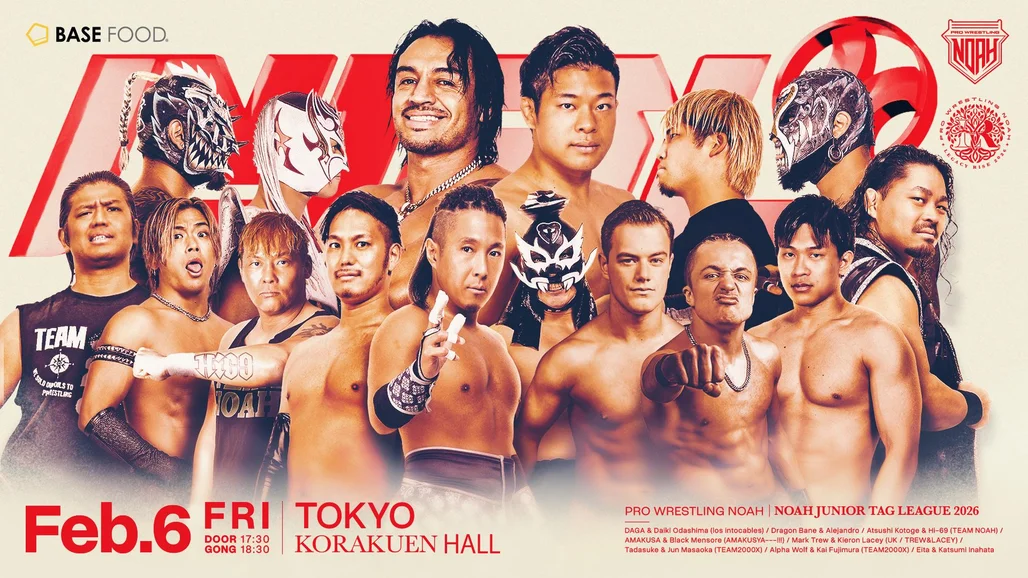 ■Match Lineup ◯The 1st Match・NOAH Jr. TAG LEAGUE 2026 Official Matches 15-Minute Single Match Tadasuke & Jun Masaoka(TEAM 2000X) vs Eita & Katsumi Inahata ◯The 2nd Match・NOAH Jr. TAG LEAGUE 2026 Official Matches 15-Minute Single Match Atsushi Kotoge & Hi69(TEAM NOAH) vs AMAKUSA & Black Mensore ◯The 3rd Match・8-man Tag Team Match 20-Minute Single Match Naomichi Marufuji & Kenoh & Hajime Ohara & Hayato Koyanagi vs Kaito Kiyomiya & Harutoki & Hiroto Tsuruya & Aoi Takahashi ◯The 4th Match・L・T・J vs W・R・S 20-Minute Single Match Tetsuya Naito & BUSHI & RYUSEI(LOS TRANQUILOS de JAPON) vs KENTA & HAYATA & Tetsuya Endo(White Raven Sqwad) ◯The 5th Match・6-man Tag Team Match 30-Minute Single Match Yoshiki Inamura & Galeno & Manabu Soya vs OZAWA & Masa Kitamiya & Takashi Sugiura(TEAM 2000X) ◯Semi-Final・NOAH Jr. TAG LEAGUE 2026 Official Matches 15-Minute Single Match Daga & Daiki Odashima vs Alpha Wolf & Kai Fujimura(TEAM 2000X) ◯Main Event・NOAH Jr. TAG LEAGUE 2026 Official Matches 15-Minute Single Match Dragon Bane & Alejandro vs Mark Trew & Kieron Lacey