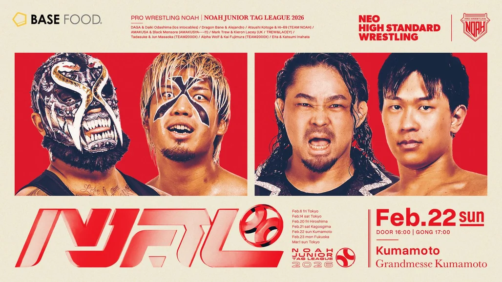試合開始は17:00を予定 ■対戦カード 〇第1試合・6人タッグマッチ 15分一本勝負 清宮海斗 & ガレノ & 晴斗希 vs 拳王 & 鶴屋浩斗 & 髙橋碧 〇第2試合・タッグマッチ 20分一本勝負 丸藤正道 & 大原はじめ vs マサ北宮 & 杉浦貴 〇第3試合・シングルマッチ 20分一本勝負 OZAWA vs 小柳勇斗 〇第4試合・NOAH Jr. TAG LEAGUE 2026公式戦 15分一本勝負 小峠篤司 & Hi69 vs マーク・トゥリュー & キーロン・レイシー 〇第5試合・NOAH Jr. TAG LEAGUE 2026公式戦 15分一本勝負 アルファ・ウルフ & カイ・フジムラ vs Eita & 稲畑勝巳 〇第6試合・NOAH Jr. TAG LEAGUE 2026公式戦 15分一本勝負 ドラゴン・ベイン & アレハンドロ vs タダスケ & 政岡純 〇セミファイナル・NOAH Jr. TAG LEAGUE 2026公式戦 15分一本勝負 ダガ & 小田嶋大樹 vs AMAKUSA & ブラックめんそーれ 〇メインイベント・6人タッグマッチ 60分一本勝負 Yoshiki Inamura & 征矢学 & モハメド ヨネ vs KENTA & 遠藤哲哉 & HAYATA