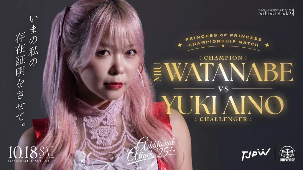 試合開始は11:30を予定 ■対戦カード 〇第1試合・タッグマッチ 20分一本勝負 芦田美歩 & 小夏れん vs キラ・サマー & 七瀬千花 〇第2試合・アイアンマンヘビーメタル級選手権試合 5WAYマッチ 20分一本勝負 <王者>桐生真弥 vs らく<挑戦者> vs 原宿ぽむ<挑戦者> vs 鈴芽<挑戦者> vs 鳥喰かや<挑戦者> ※第1778代王者は防衛戦。 ※タイトルの性質上、同選手権試合としておこなわれない場合がございます。 〇第3試合・LEVEL UP TRIAL三番勝負 15分一本勝負 山下実優 vs 鈴木志乃 〇第4試合・LEVEL UP TRIAL三番勝負 15分一本勝負 中島翔子 vs 高見汐珠 〇第5試合・LEVEL UP TRIAL三番勝負 15分一本勝負 瑞希 vs 風城ハル 〇第6試合・First One-on-One 15分一本勝負 荒井優希 vs ハイパーミサヲ 〇第7試合・インターナショナル・プリンセス選手権試合 30分一本勝負 <王者>遠藤有栖 vs アリス・クロウリー<挑戦者> ※第15代王者は初防衛戦。 〇セミファイナル・プリンセスタッグ選手権試合 30分一本勝負 <王者組>上福ゆき & 上原わかな vs まなせゆうな & 凍雅<挑戦者組> ※第19代王者組は初防衛戦。 〇メインイベント・プリンセス・オブ・プリンセス選手権試合 30分一本勝負 <王者>渡辺未詩 vs 愛野ユキ<挑戦者> ※第16代王者は初防衛戦。