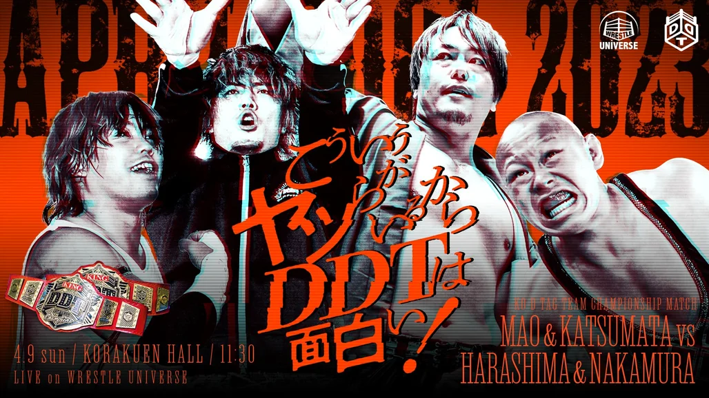 April Fool 2023 試合開始は11:30を予定 ※ダークマッチ開始は11:10頃を予定 ■対戦カード ○ダークマッチ 15分一本勝負 MJポー&KANON vs アントーニオ本多&須見和馬 ○オープニングマッチ 瑠希也デビュー戦 30分一本勝負 高鹿佑也 vs 瑠希也 ○第二試合 30分一本勝負 大鷲透&平田一喜&伊橋剛太 vs 彰人&川松真一朗&小嶋斗偉 ○第三試合 ハリマオvsEruption! 30分一本勝負 樋口和貞&中津良太&石田有輝 vs 坂口征夫&赤井沙希&岡谷英樹 ○第四試合 スペシャルシングルマッチ 30分一本勝負 上野勇希 vs 夢虹 ○第五試合 スペシャル8人タッグマッチ 30分一本勝負 遠藤哲哉&秋山準&鈴木鼓太郎&岡田佑介 vs 土井成樹&クリス・ブルックス&ジョーイ・ジャネラ&正田壮史 ○セミファイナル WORLD HINO CLASSIC~決勝戦~ 30分一本勝負 火野裕士&"brother"YASSHI&大石真翔 vs 飯野“セクシー”雄貴&男色“ダンディ”ディーノ&今成“ファンタスティック”夢人 ○メインイベント KO-Dタッグ選手権試合 60分一本勝負 <王者組>MAO&勝俣瞬馬 vs HARASHIMA&中村圭吾<挑戦者組> ※第76代王者組5度目の防衛戦。 ◆実況解説(予定) <実況> 村田晴郎(冒頭&第3試合〜メインイベント) 加藤憲(ダークマッチ〜第2試合) <解説> 小佐野景浩 <ゲスト解説> 谷真理佳(SKE48)