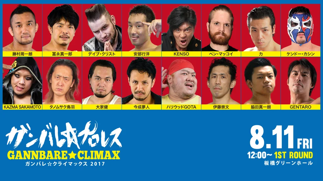 2017年8月11日 東京・板橋グリーンホール ガンバレ☆プロレス「ガンバレ☆クライマックス 2017 1st ROUND」を配信! ※権利上の都合により一部で消音する場合がございます。予めご了承ください。 ■対戦カード ○トーナメント1回戦 勝村周一朗 vs 冨永真一郎 ○トーナメント1回戦 デイブ・クリスト vs 安部行洋 ○トーナメント1回戦 KENSO vs ベン・マッコイ ○トーナメント1回戦 力 vs ケンドー・カシン ○トーナメント1回戦 KAZMA SAKAMOTO vs タノムサク鳥羽 ○トーナメント1回戦 大家健 vs 今成夢人 ○トーナメント1回戦 ハリウッドGOTA vs 伊藤崇文 ○トーナメント1回戦 脇田真一朗 vs GENTARO